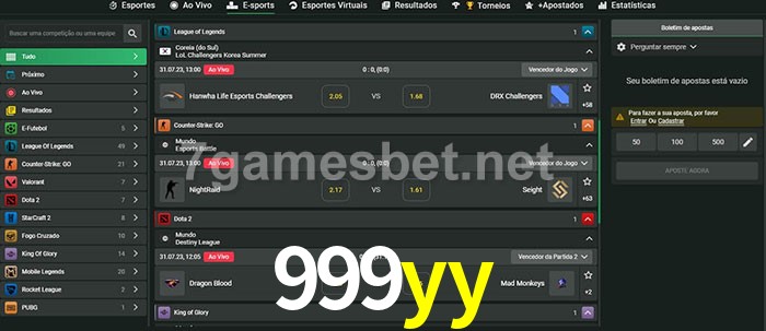 O 999yy oferece uma grande seleção de opções de apostas em e-sports com probabilidades competitivas